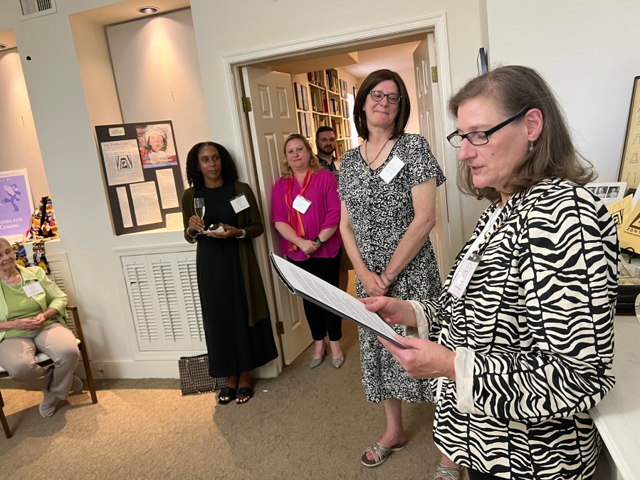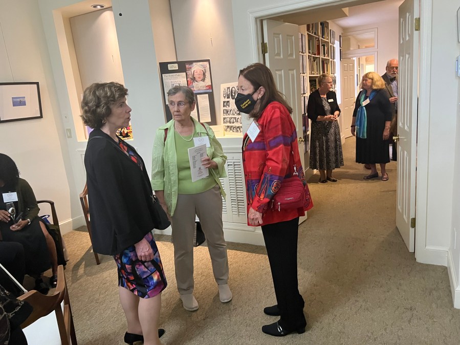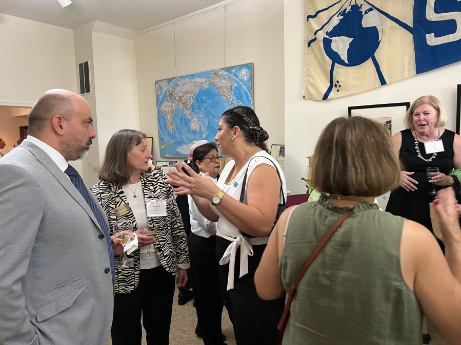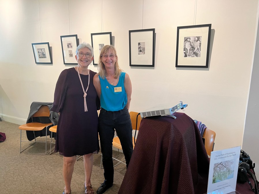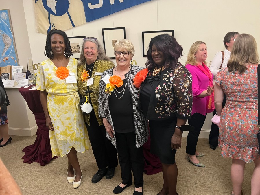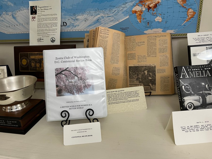 President Rosa Goldsmith welcomes members and guests to the Centennial Celebration at The Society of Woman Geographers (SWG) on Capitol Hill, September 18, 2022.President Rosa Goldsmith and former Club Presidents: L to R -Janet Southby, Ramona Stoltz, KT Harroun, Marilu del Carpio, Mary Ellen Bittner (Past Zonta International President), Sonya Baskerville, Jen Christensen, Deena Douglas, and Marta Calderon.Club members with 25 or more years of Zonta membership, advocacy, and service.Members and guests enjoying the celebration in the SWG Library.Past President Marta Calderon and member Sandra Ortega and Club Secretary Michele Smith.Past President KT Harroun and club members Judith Fitzpatrick and Kathy Deutsch.President Rosa Goldsmith with guests in the exhibit area. In the upper right is the SWG flag carried by Amelia Earhart on one of her historic flights. Amelia Earhart was a member of both Zonta and SWG.Past Presidents Marta Calderon and Jen Christensen preparing to start the Centennial video presentation.Area 4 Director Ramona Stoltz with Julika Enslin, graduate student at Georgetown, and Iain Guest, Executive Director of The Advocacy Project, Washington, DC.Photos above and below show members wearing orange in support of the Zonta campaign “Zonta Says NO to Violence against Women.”Zonta District 3 guests: Governor Lisa Burton, Past Governor Joanne Gallos, and Area 2 Director Linda Foster. Exhibit of awards and memorabilia from the Archives of the Zonta Club of Washington, D.C.Recipe Book from the member’s submissions in celebration of the Club’s Centennial Anniversary. Display of the 1922 Charter of the Zonta Club of Washington, District of Columbia.